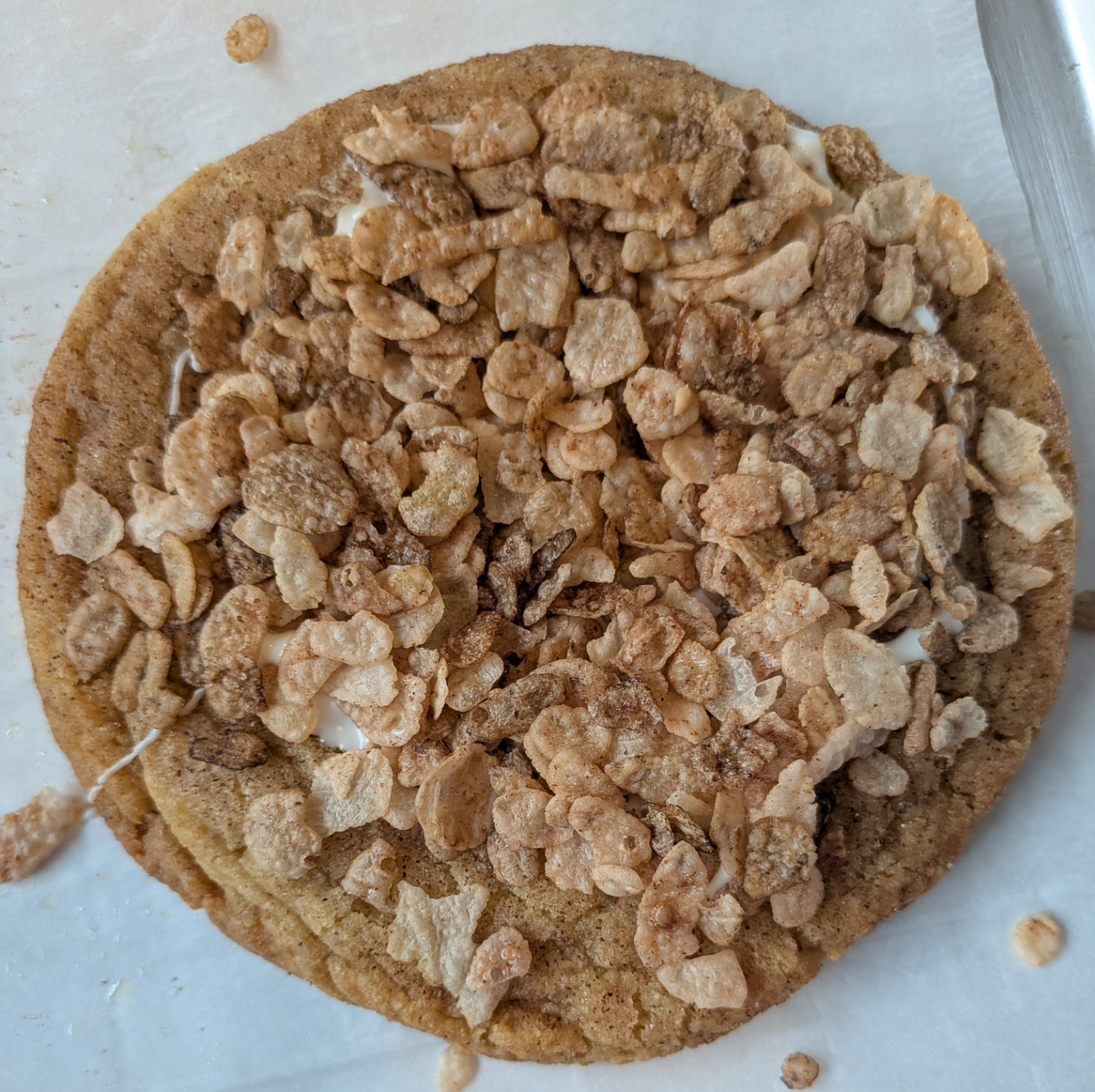 This vanilla cinnamon sugar cookie is filled with white chocolate and caramel and dusted with cinnamon sugar and topped with white chocolate and cinnamon pebbles